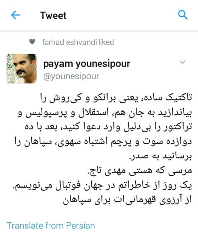 یونسی پور شب گذشته توئیت عجیبی کرده که مطمئنا نمی تواند واقعیت داشته باشد، او مدعی است که تاج به سپاهان تمایل دارد و تمام بلواهای این چند وقت اخیر برای هموار شدن راه قهرمانی سپاهان بوده، ادعایی که به نظر گزاف می آید.