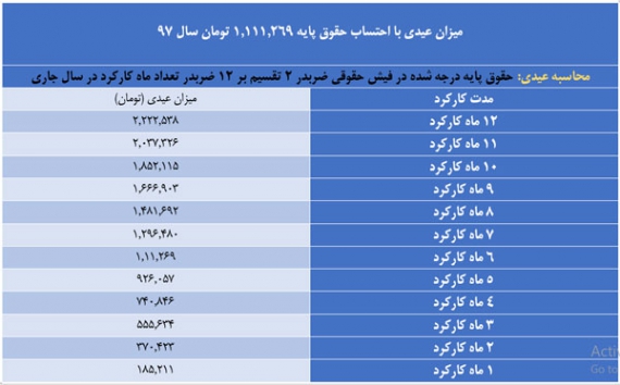 در جدول بالا عیدی کارکنان مشمول قانون کار با دریافت حداقل دستمزد ۹۷ به میزان مدت اشتغال در محل کار فعلی محاسبه شده است.
